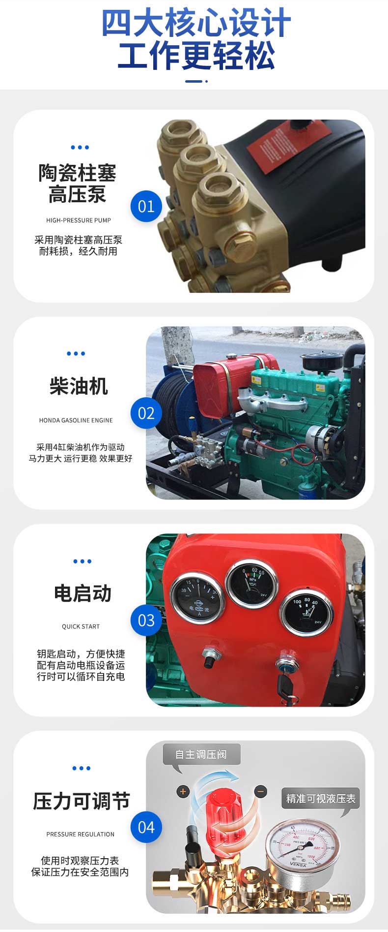 RJHT-800型 41馬力柴油機驅(qū)動的大流量高壓管道疏通清洗機,采用意大利進口高壓泵,壓力調(diào)節(jié)裝置、不銹鋼壓力表和精密過濾器等多種安全防護裝置,具有安全性高,使用操作穩(wěn)定等優(yōu)點。